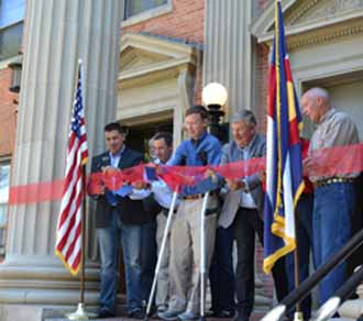 Dignitaries at the ribbon cutting September 21, 2013 (l to r): State Representative Leroy Garcia, Department of Local Affairs Executive Director Reeves Brown, Governor John Hickenlooper, State Senator Larry Crowder, Bent County Commissioner Bill Long.